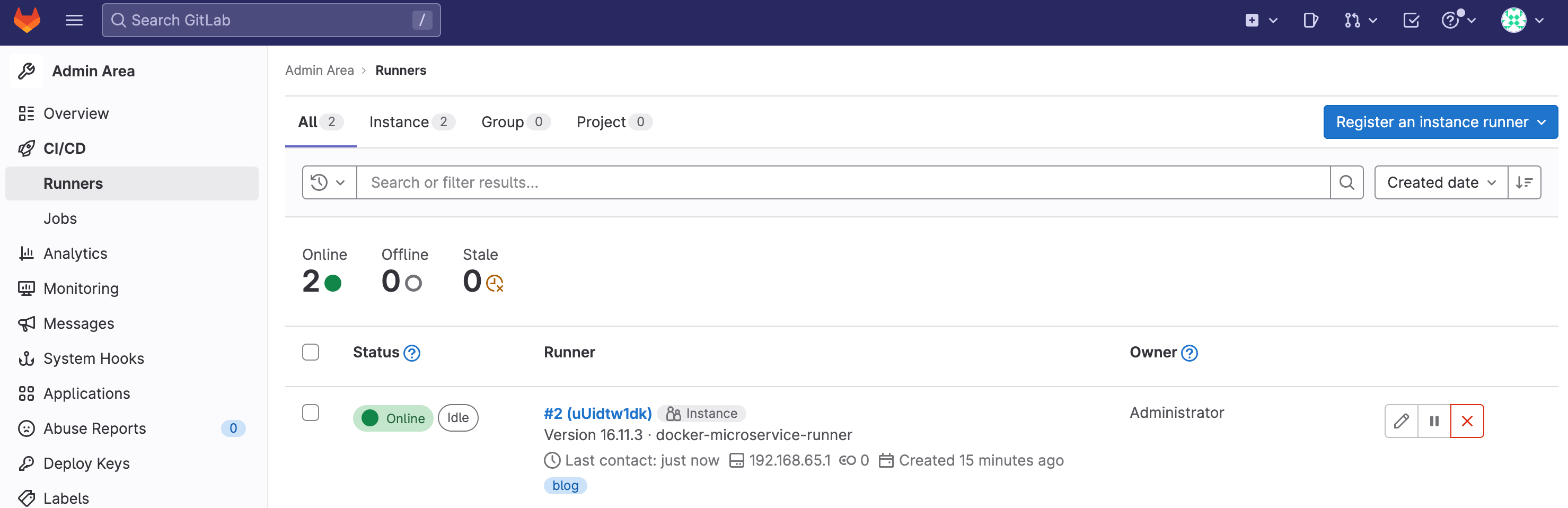 1 2 3 4 5 6 7 8 9 10 11 12 13 14 15 16 17 18 19 20 21 22 23 24 25 26 27 28 29 30 31 32 // 第一步:输入gitlab的访问地址即可 Enter the GitLab instance URL (for example, https://gitlab.com/): http://192.168.168.168:8888 // 第二步:输入 从gitlab管理页面上的复制token Enter the registration token: pAovXYzGHsy5EWF7zKiU // 第三步:输入runner名称 比如:docker-microservice-runner Enter a description for the runner: [94030fed2ba3]: docker-microservice-runner // 第四步:输入Tag 比如:blog Enter tags for the runner (comma-separated): blog // 第五步:输入说明备注 直接回车跳过 Enter optional maintenance note for the runner: WARNING: Support for registration tokens and runner parameters in the 'register' command has been deprecated in GitLab Runner 16.11 and will be replaced with support for authentication tokens. For more information, see https://gitlab.com/gitlab-org/gitlab/-/issues/380872 Registering runner... succeeded runner=pAovXYzG // 第六步:这个时候可以看到上面日志已经注册完成,选择执行器 docker Enter an executor: docker, parallels, virtualbox, docker+machine, docker-ssh+machine, instance, kubernetes, custom, docker-ssh, shell, ssh: docker // 第七步:选择默认基础镜像,这个镜像其实无所谓,因为我们在实际CICD中会指定镜像。这里就直接填 docker:24.0.2 Enter the default Docker image (for example, ruby:2.7): docker:24.0.2 Runner registered successfully. Feel free to start it, but if it's running already the config should be automatically reloaded! Configuration (with the authentication token) was saved in "/etc/gitlab-runner/config.toml"