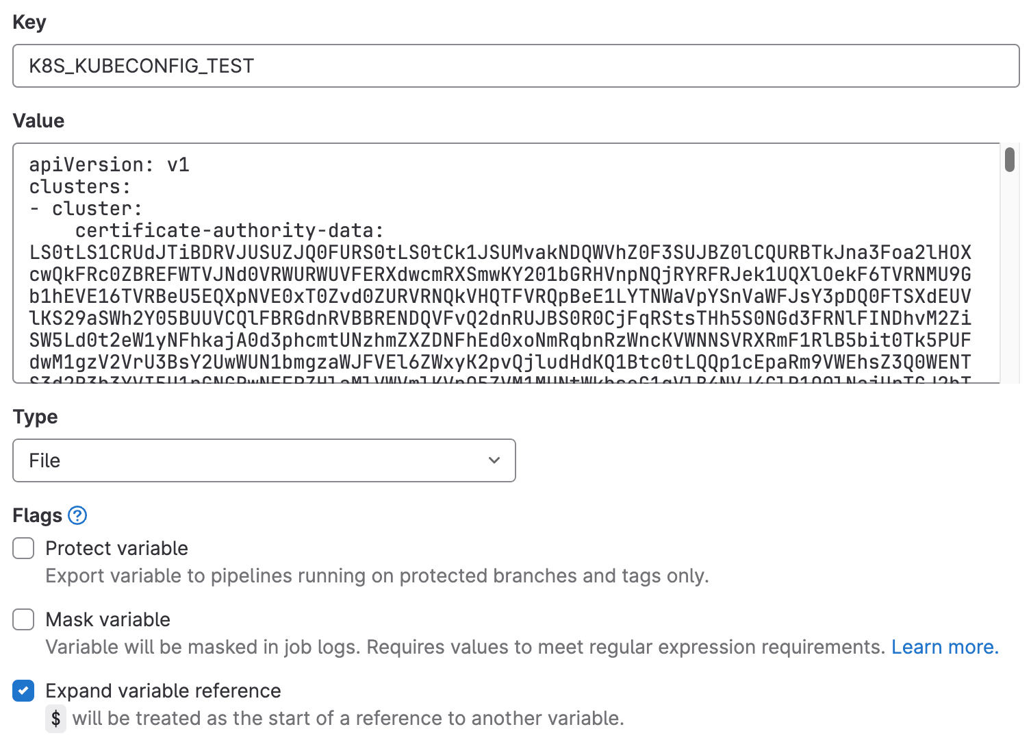 注意K8sconfig变量类型为 File 文件内容就是集群的KubeConfig