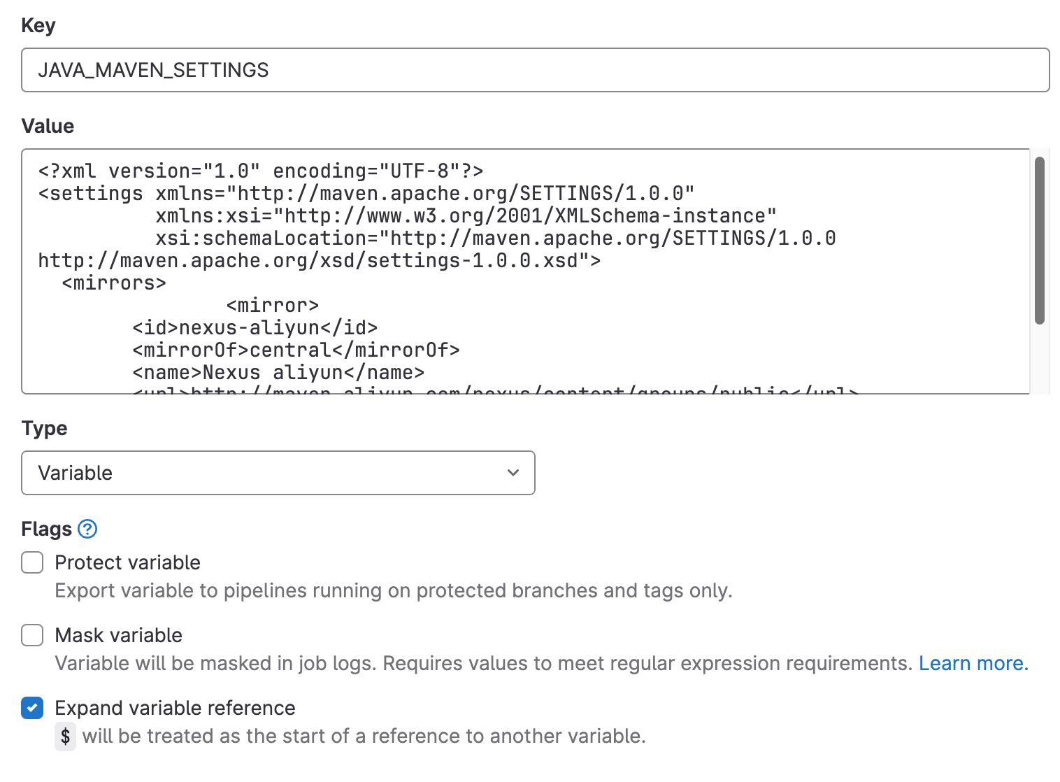 构建JAVA微服务CICD 整个流程:maven打包得到jar包 -> Dockerfile构建镜像并上传仓库 -> Kubectl部署到K8s集群 在这个过程中,牵扯到账号信息,为了安全方便可以配置成CICD变量。