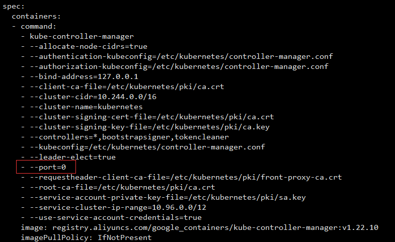 如果出现状态出现 Unhealthy,就需要删掉配置中- --port=0 这一行 vim /etc/kubernetes/manifests/kube-controller-manager.yaml vim /etc/kubernetes/manifests/kube-scheduler.yaml